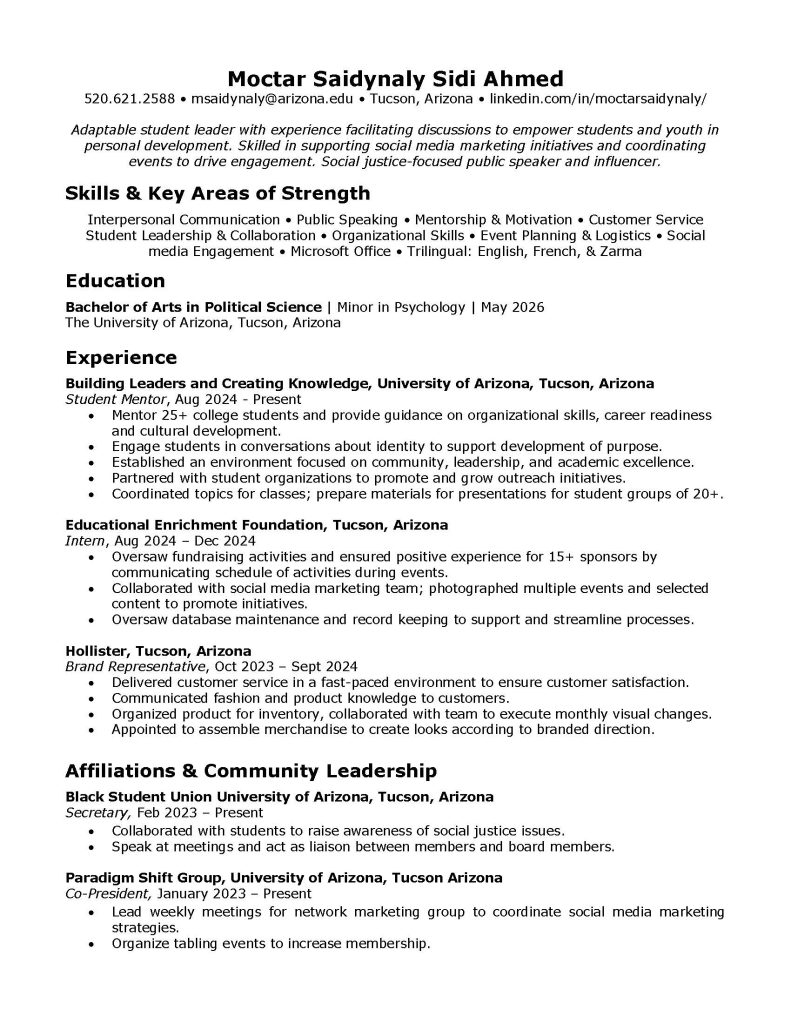 - Moctar is a leader on-campus and wants to communicate his ability to collaborate and connect with students in-person and online.